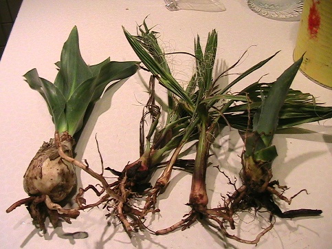 De eerste ken ik niet. Het is een knol zoals een ajuin met een stijf blad zoals van een yucca. De stam zou verhouten.