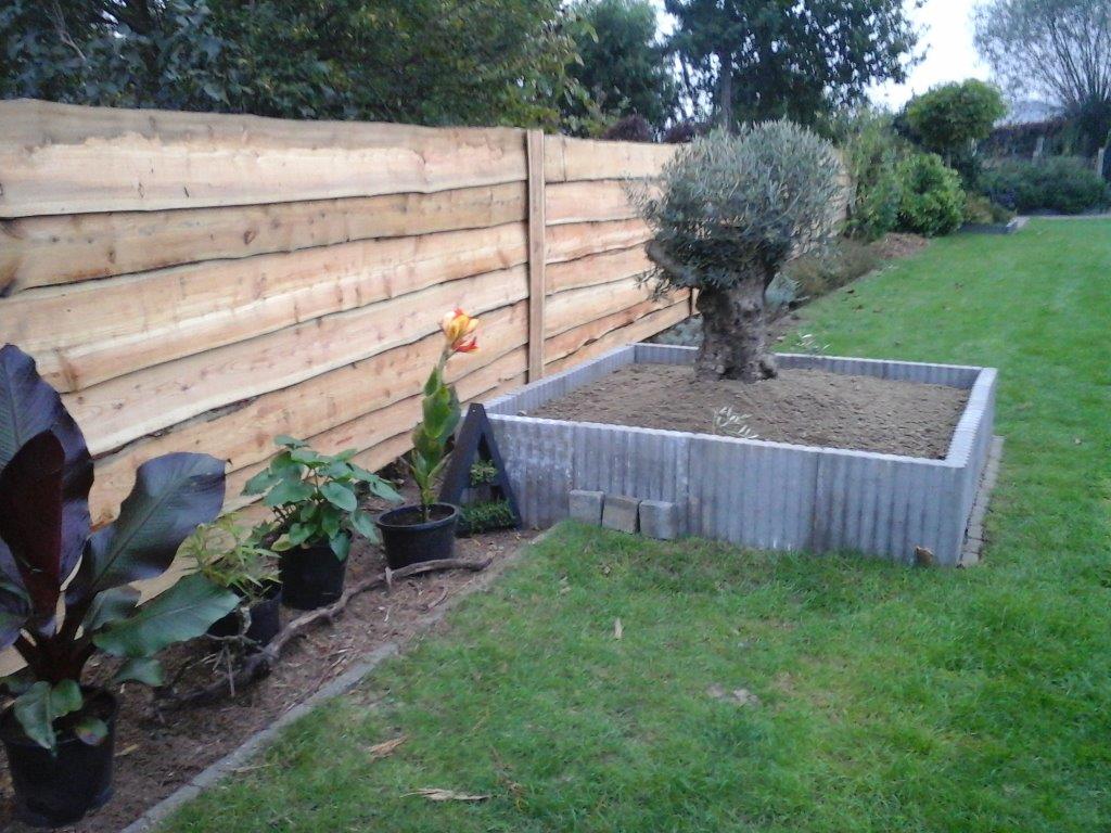 Links ziet het er voor ons al redelijk uit. Rechts nog veel werk, en plaats voor bananen, holle pijp en enkele originele bloemenbollen. Laat het maar vlug weer lente zijn!