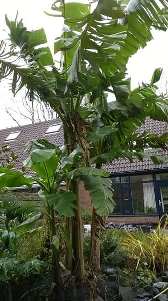 Nog een paar foto's van de Musa basjoo tijdens de storm november 2016. Ik heb toen in de achtertuin het blad er af gehaald. Dat was toch helemaal aan reepjes gewaaid. Naast mijn huis staan de Musa's wat beschutter. Daar was het blad nog mooi ondanks vorst en wind. Maar nu werd de vorst toch wat te heftig (-6 ofzo) en is het blad ook daar kapot. In de achtertuin staan de stammen nu omwikkeld met fleecedoek in een korf met platanenblad. Ik ga het geheel nog afdekken tegen de regen.