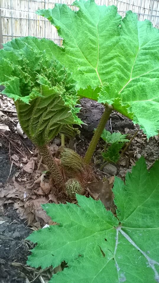 De Gunnera manicata staat nu een jaar en begint goed aan zijn tweede groeiseizoen. Hij is de winter goed door gekomen met een omgekeerde speciekuip over de groeipunt om rechtstreeks contact met de winterbescherming te voorkomen en daarmee risico op condenswater en rotting (better safe then sorry). Daar bovenop wat plantenafval en isolatiemateriaal (noppenfolie enz en afgedekt met een zeiltje om de boel droog te houden. Datum van de foto's is 22 april 2017. Afgelopen week is er nachtvorst geweest dat overal het blad van de manicata's kapot heeft gemaakt. Hier (dicht bij de kust en midden in de stad) heeft hij, nu onbeschermd, gelukkig geen schade.