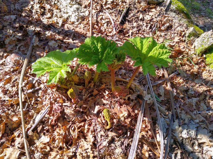 De Gunnera begon eind januari al levenstekens te vertonen. Hopelijk wordt hij nu heel groot, maar het groeiseizoen duurt maar tot eind juni, daarna is het te warm en staat hij stil.