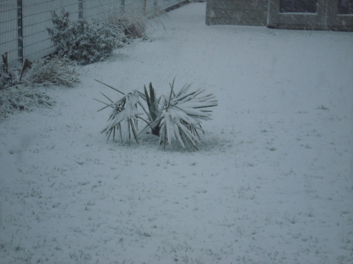 De Chamaerops humilis die zonder jasje in de vrieskoude staat