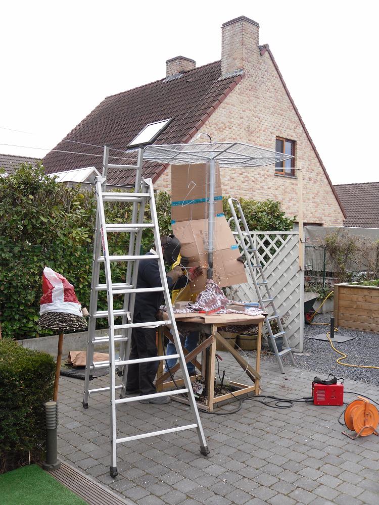 Als laatste zijn we een staantafel aan het maken met daarboven een leiconstructie. We hebben een staalnet genomen en een vorm uitgeslepen, alles bedekt met bekaert draad en grijs gespoten om zo weinig mogelijk op te vallen in de lucht. Vorig jaar hadden we reeds de paal in de grond verankerd en 3 druivenstokken aangeplant(1 blauwe en 2 witte). Was de bedoeling om ze eerst tot 3m te laten uitlopen en daarna de constructie er omheen te bouwen(anders te weinig zonlicht onder de constructie). Daarnet het tafelblad er over geschoven en het bovenste gedeelte(net en paal) erop gelast. Nu nog alles verven en de ledverlichting erop aansluiten en dan de plant langzaam leiden.