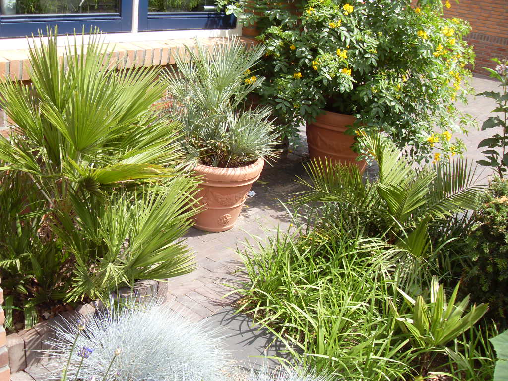 Overizicht met o.a. Chamaerops, Jubaea en Rhapidophyllum