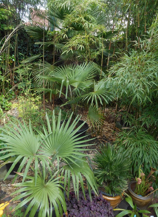 Met het donkerrode blad is Cercidiphyllum japonicum 'Rotfuchs'. Dit is een langzame groeier vergeleken bij de soort. De plant rechts daarvan is Acer x conspicuum 'Silver Cardinal' (synoniem Acer rubescens 'Silver Cardinal'). Deze bontbladige Acer is gevoelig voor zonnebrand zoals veel variëteiten Japanse esdoorns. Het verzamelen van Acers is een van mijn passies en ik kan de verleiding vaak niet weerstaan om weer met een cultivar thuis te komen. Voorlopig is zo 'n nieuwkomer gedoemd in een kuip te verblijven totdat ergens een plek vrijkomt.