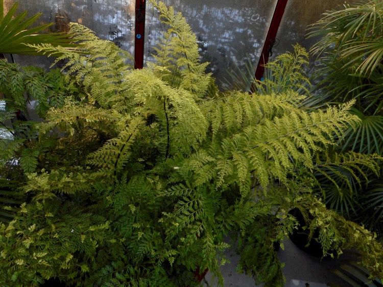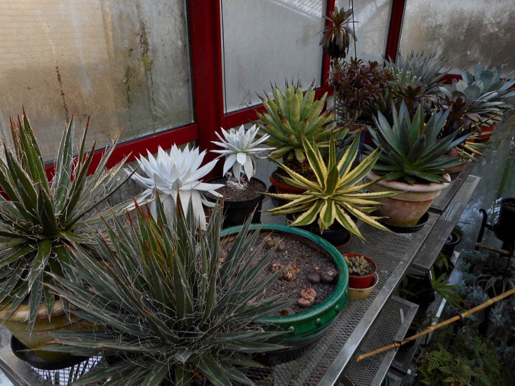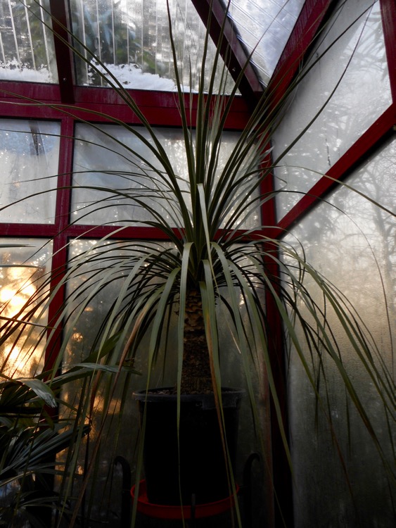 Een kas of serre is de ultieme oplossing voor de overwintering van exotische kuipplanten. Je hebt vrijwel geen omkijken naar de planten die bij de lage temperaturen en hoge luchtvochtigheid nauwelijks water behoeven. Om een goed beeld te geven is best lastig omdat de planten zo dicht opeen staan. Ik hoop dat deze poging daar enigszins in slaagt. Het is veel erger geweest en in voorgaande jaren moest ik me vaak op de knieën tussen de planten doorwurmen om hier en daar een drup water te geven. Zodra de zon aan kracht wint vanaf maart, kan de temperatuur overdag flink oplopen en stijgt de waterbehoefte.