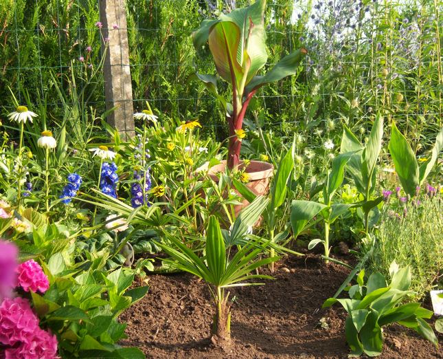 Nog een nieuw bloemenstuk van ingang tuin aangeplant met een Trachycarpus fortunei en wat canna (president), delphium pacific "Blue Bird", Euchinacea purpurea "Alba" en een Maurelli.