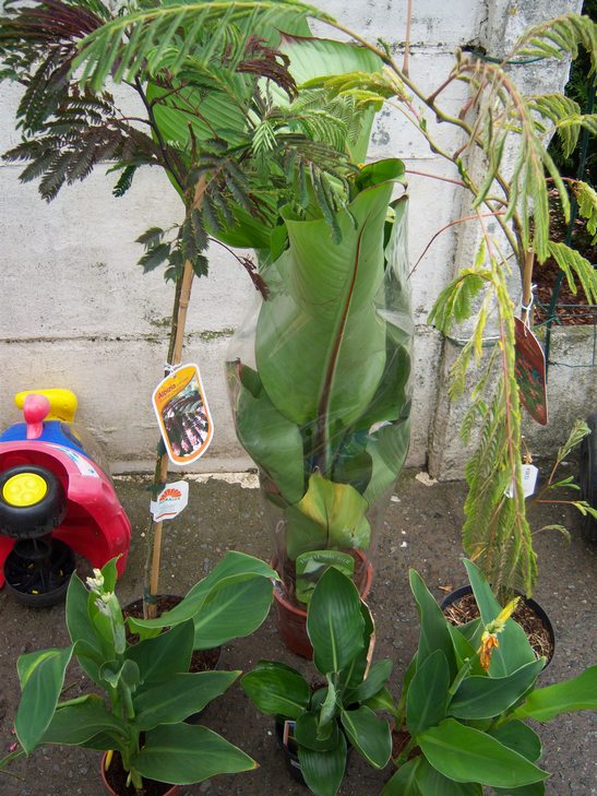 Albizia julibrissin ‘Boubri’ ombrella + Summer Chocolate en Ensente Maurelli + Canna en Strelitzia