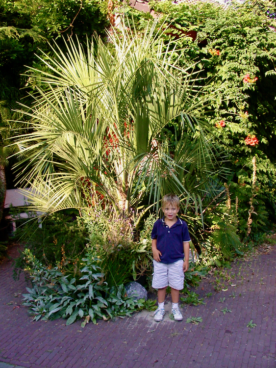 De Europese dwergpalm Chamaerops in een wat forsere variant past ook prima in een kleine tuin. Mijn grootste exemplaar doet overigens qua afmeting nauwelijks onder voor deze voormalige Butia. De Chamaerops is de laatste 2 jaar niet meer van z 'n plek gekomen en heeft zich inmiddels met de uitgroeiende wortels in de bestrating gehecht. Deze winter was een zachtgekookt eitje, maar in de voorafgaande werd het nog kortstondig - 8°C. In geval van nood zou ik de loodzware palm nog kunnen verplaatsen maar ik denk dat ik 't lot maar op z 'n beloop laat. :roll: