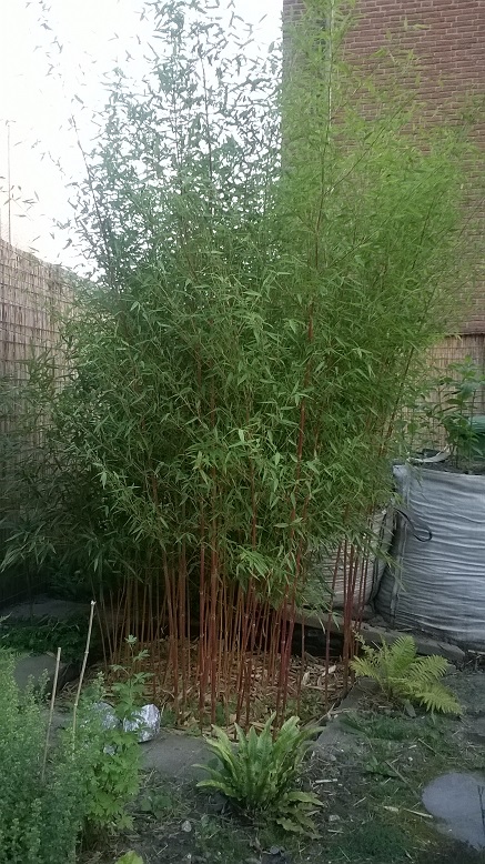 Ph. aureosulcata aureocaulis heeft veel scheuten gemaakt en ze zijn ook dikker en hoger. Met zoveel nieuwe groei lijkt de naam purpurea (rood) momenteel gepaster dan aureo (geel). Deze bamboe moet samen met de Musa's en de Gunnera voor een overweldigen effect gaan zorgen bij binnenkomst via de tuindeur. De Musa's waren al hoog, de bamboe begint nu flink volume te krijgen maar kan nog dubbel zo groot worden. En dit jaar doet de Gunnera tinctoria al flink zijn best, maar volgend jaar hoop ik de manicata aan te kunnen planten. Ik kijk er erg naar uit.