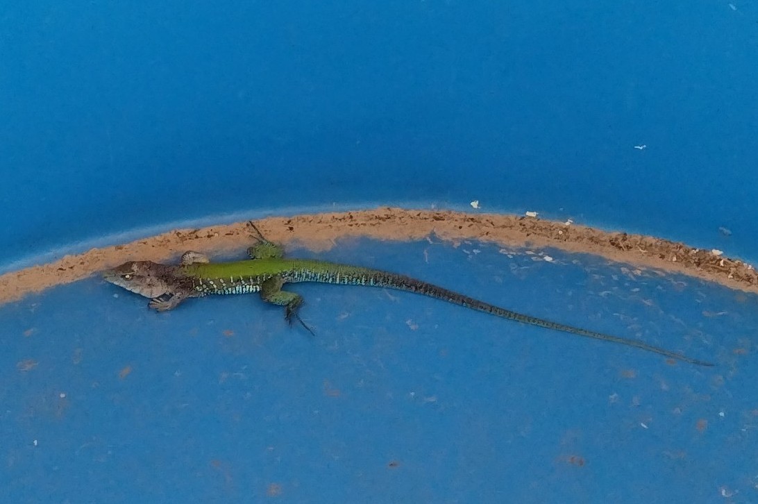 Normaal gesproken gebruiken we ons vaste zwembadje maar daar had zich afgelopen dagen een ongenode gast in gevestigd, die er op eigen kracht niet meer uit kon komen ( bijna 2 meter diep). Uiteindelijk heb ik hem na een klein onderzoekje m.b.t. evt. gevaren zoals giftigheid e.d. eigenhandig weer in de vrije natuur uitgezet.