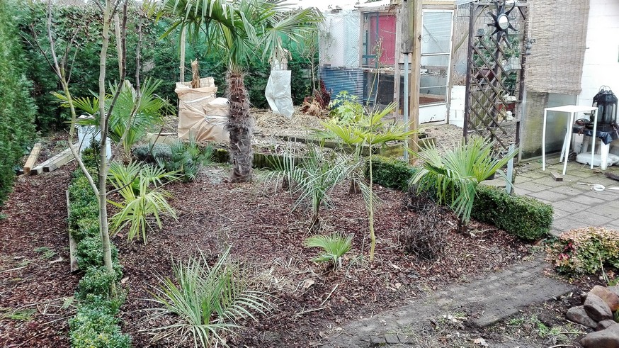 Let wel op met de zon op die nieuwe aanplant Ed. De zon kan zelfs nu al verraderlijk scherp zijn op palmen. Zal op Butia yatay en armata wel meevallen, maar op de zachtere bladeren (bij Washingtonia) kan dat al snel leiden tot verbranding.