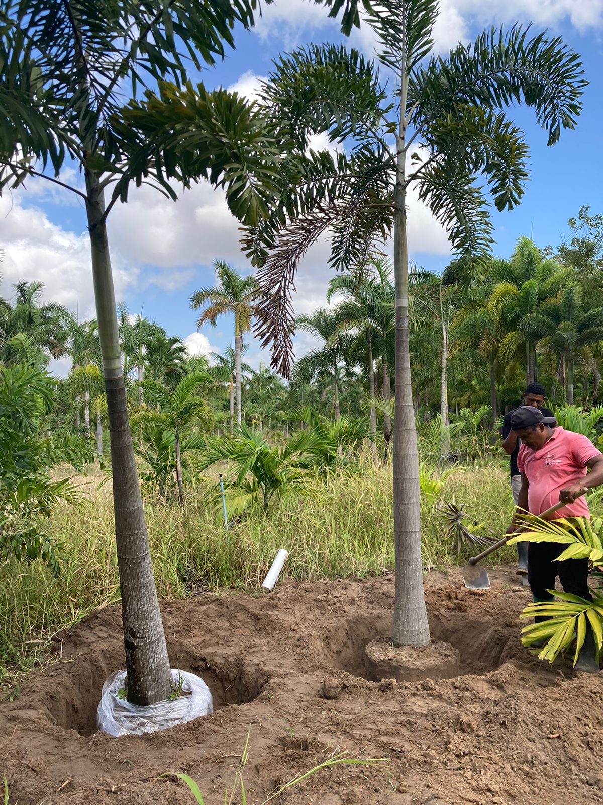 De foto's doen de kluiten kleiner lijken dan ze in werkelijkheid zijn. Beiden zijn loodzwaar en staan in een plantgat van ongeveer 70 a 80 cm diep. Vanaf eind augustus tot +/- december staat hier dagelijks een stevige wind maar ze hebben nog geen krimp gegeven. Wel zijn de oudste 3 veders van beide palmen al verdroogd, iets wat ik ook wel te verwachten was. Over het algemeen duurt het hier wel een paar maandjes tot dit formaat van zo'n verplaatsing hersteld.