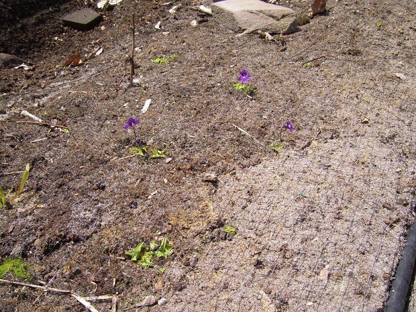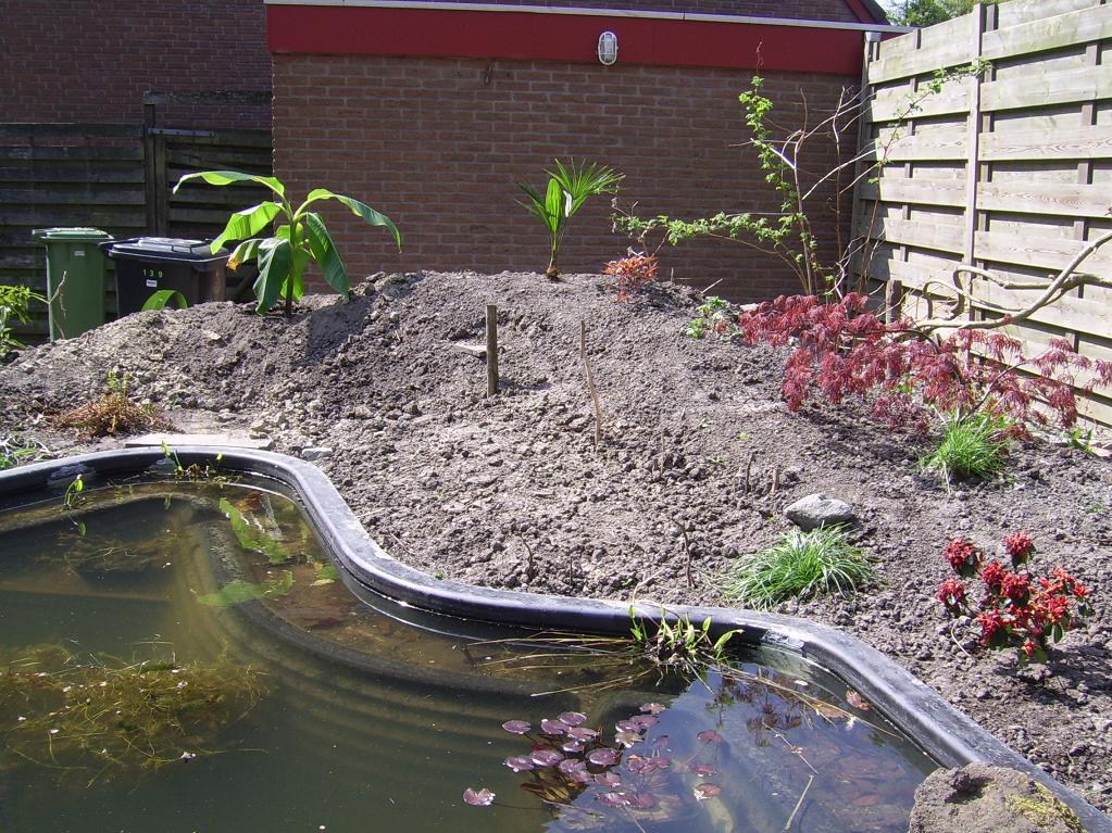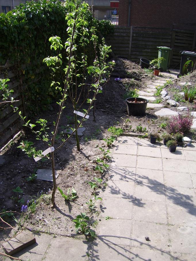 Mijn eerste Trachycarpus fortunei heeft zijn eerste winter buiten overleefd. Mijn appel- en perenboompjes staan in bloei en 2 soorten aardbeien zijn geplant en lopen snel uit. Een deel van de kruiptijm is aangeplant rond de stapstenen.