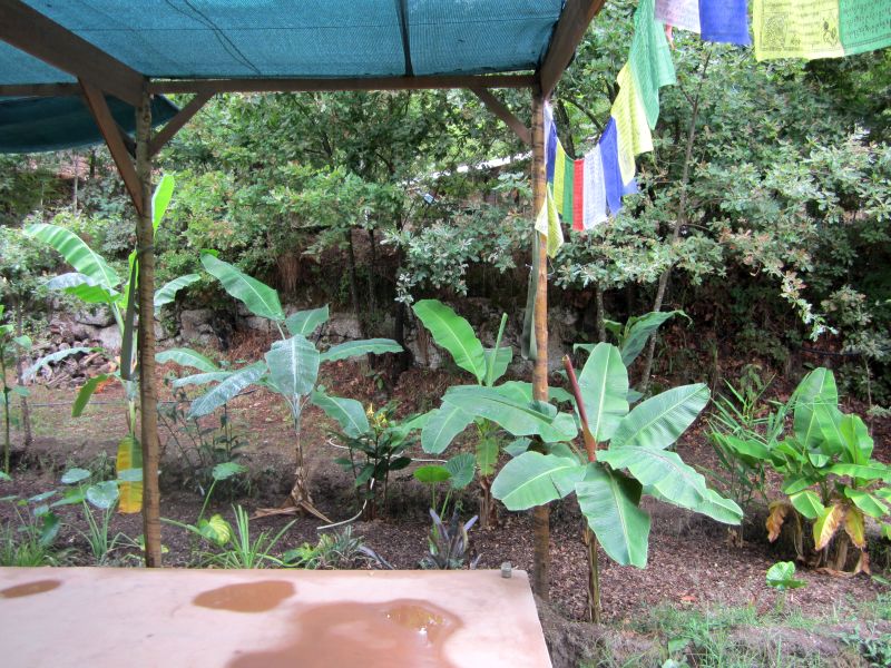 Vorig jaar hebben we een buitenvloer laten storten van 5x10m (mijn vrouw geeft yogales en nu kan dat dus ook buiten). Later in 2019 heb ik daar een 3m hoge overkapping met schaduwdoek overheen gebouwd en afgelopen voorjaar heb ik er een L-vormige tropenborder omheen aangelegd. De korte arm van de L is ongeveer 7m lang, de lange arm van de L is ongeveer 14m. Eerste reeks foto's: aanleg border april 2020. Dwz omspitten, met de houweel ondergrond loshakken en wortels verwijderen, vervolgens laag zelfgemaakte compost aanbrengen.