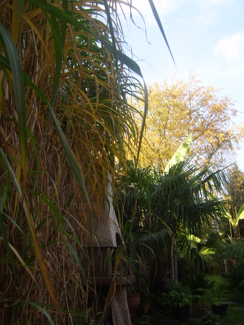 gisteren een nieuw stuk gazon weggehaald om plaats te maken voor de musa's, de plant in't midden heb ik al 3 jaar met succes buiten kunnen overwinteren met behulp van een lichtslang, het begint stilaan een reus te worden...