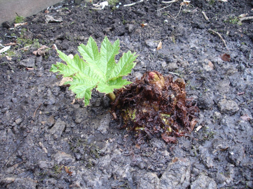 vandaag een nieuwe aanwinst onmiddelijk in volle grond geplaatst waarbij ik Bol wil bedanken voor de mooie plant :thai: de echte gunnera manicata (a)