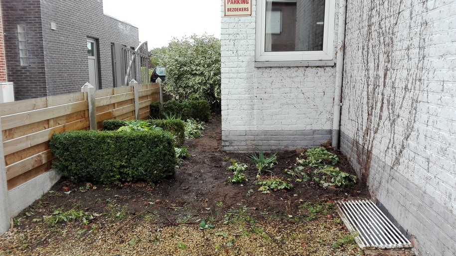 Zo links van mijn huis op de noordkant, dus veel schaduw en droog, is nu af op afwerking met steentjes na dan en plaatsen van vuurdoorn tegen muur van raam.