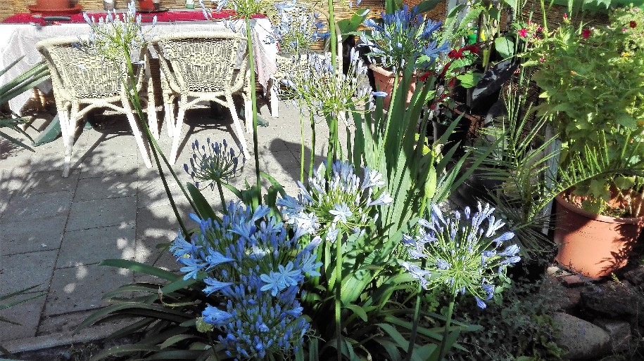 Bananen zijn nu pas op gang aan het komen en de agapanthus doet het dit jaar uitstekend.