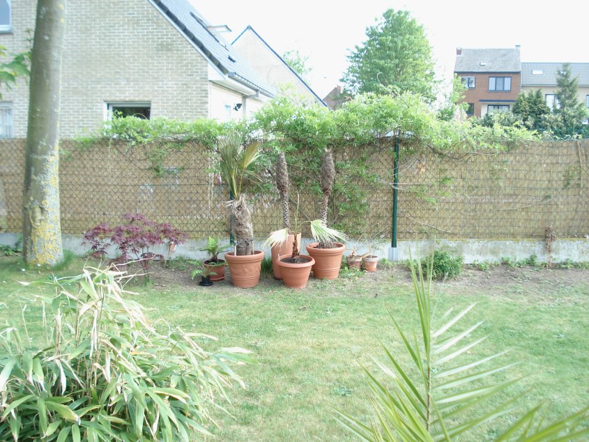 Links in het midden staat de T. fortunei van het balkon in volle grond. De Washingtonia voor het tuinhuis is de zaailing van de voorlaatste foto. :D
