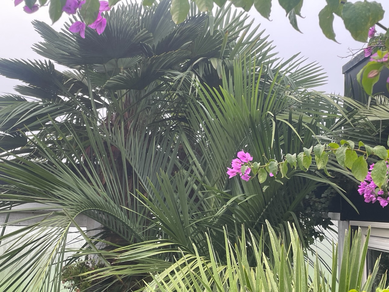 En mijn groene eriospatha vandaag tussen uitgeplante chamaerops, wagnerianus en bougainvillea.