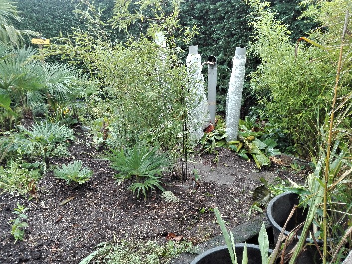 Het ziet er nog allemaal niet zo fraai uit maar nu pas begint de schade aan de planten zich te laten voelen. De wagnerianus heeft echt wel veel geleden en de coniferen omg. Aan de buurman zijn kant is die nog groen maar aan de mijne bruin.