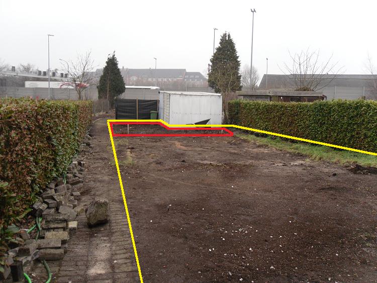 In het midden ga ik mijn Ensete maurelli op een kunstmatige heuvel van ongeveer 1 meter hoog plaatsen zodat deze een echte blikvanger wordt. Hoe ik de rest zal aanplanten moet ik nog even over brainstormen. Het klinkerpad ga ik volledig opkuisen en afboorden. Hierbij een foto van de actuele toestand, nog niet veel speciaals maar hoop snel verder te kunnen werken :). De rode lijn is de border van vorig jaar en ook een foto van de bananen vorig jaar, de gele hoe het dit jaar wordt. De oppervlakte is 22m x 7m.