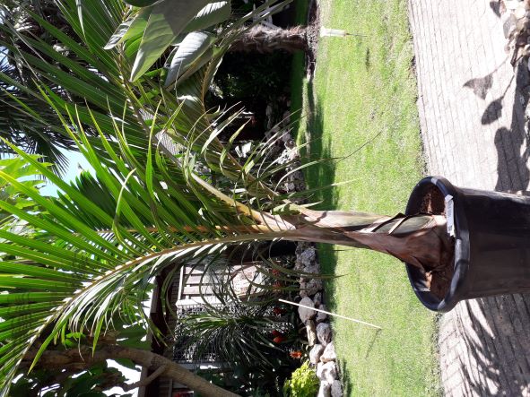 Mooie Veitchia, welke soort is het? Zo ver ik weet is er geen één van dit geslacht die clusters. Vermoed dat hier meerderen jonge planten in 1 pot zijn aangeplant. Heb je een close up van de stammetjes en het blad? Doet op deze manier wat denken aan Ptychosperma.