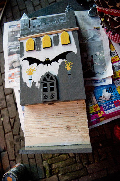 Hey Dimi, we hebben alle vereisten voor een vleesmuisverblijf van internet geplukt, hoe dik , hoe breed hoe hoog het kastje moet zijn, verder moet het ruw hout zijn en de vliegingang echt heel smal, ik geloof dat de ingang maar 1,5 cm breed is en het verblijf zelf maar 3 cm erg plat dus. Verder moet ie dalijk 3 minimaal 3 meter hoog hangen, op het zuiden of zuidwesten zodat de zon (als de zon schijnt tenminste) het verblijf kan opwarmen. Wij zijn ook zeer benieuwd of de woning dalijk bewoont zal zijn. Ik wacht nu nog op wat houten ornamenten die op het kasteel komen en dan nog wat schilderen en dan kan ie de bomen in (letterlijk en figuurlijk)