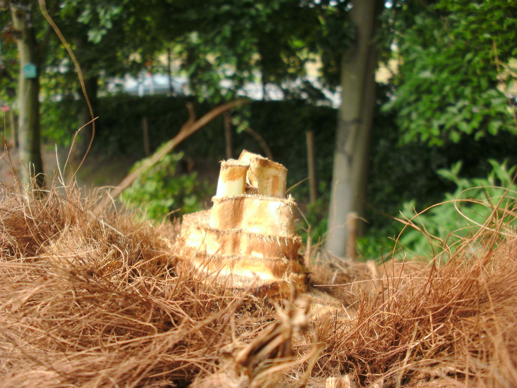zo de houten ornamenten zijn ook net binnen gekomen en corrine is bezig met de laatste hand te leggen aan het schilderwerk en geloof mij hij wordt echt super, denk zelfs dat er een ware oorlag zal ontstaan tussen de vleermuizen wie er mag komen wonen verder nog even een foto van onze grote palm die nadat we hem hadden afgezaagd geheel hersteld is van de speerrot en nu weer lekker aan de groei is