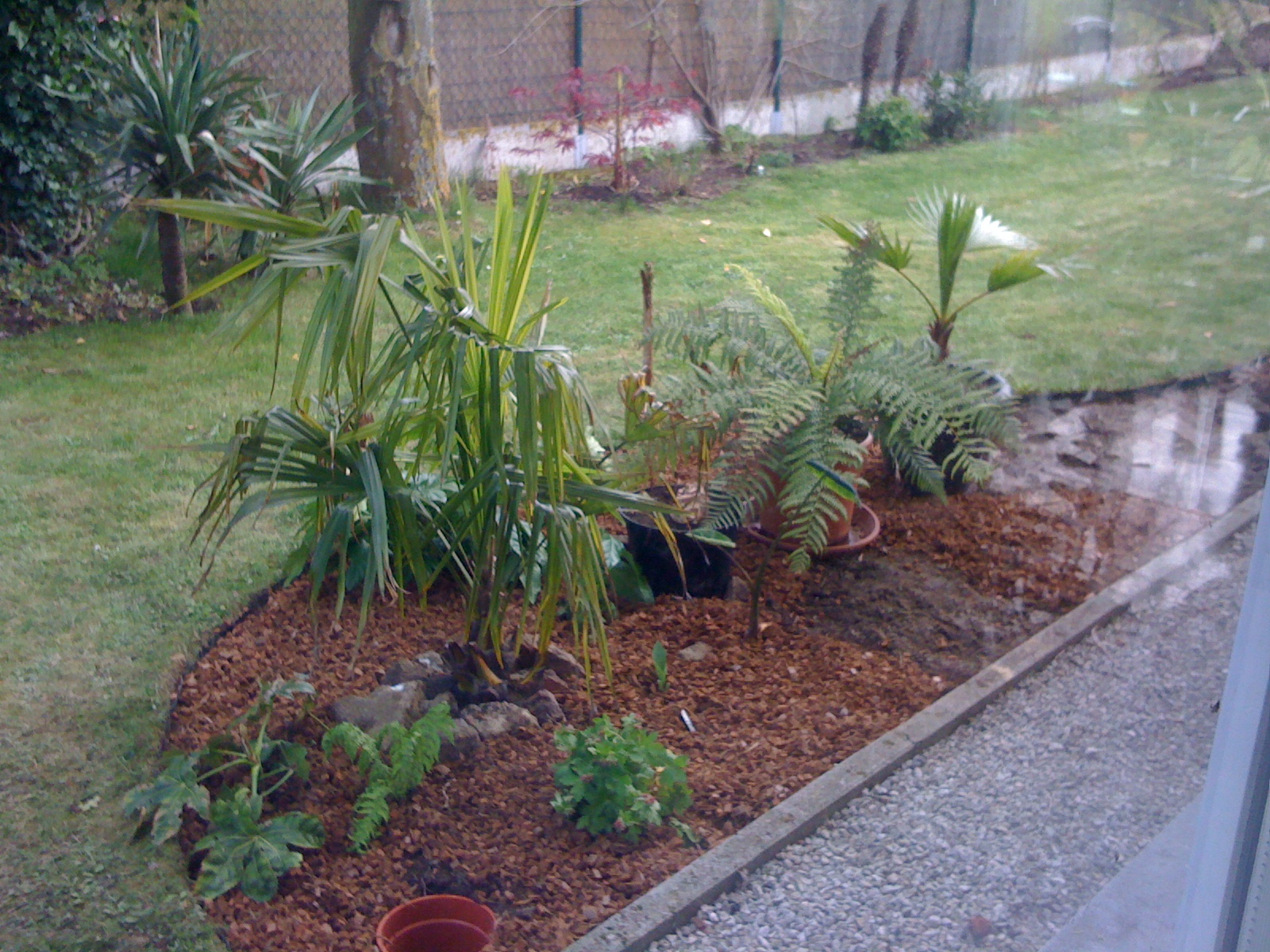 Helemaal rechts staat een laagblijvende bamboe en in het plantgat ernaast zet ik een Acer palmatum die dit weekend bij de Gamma worden verkocht