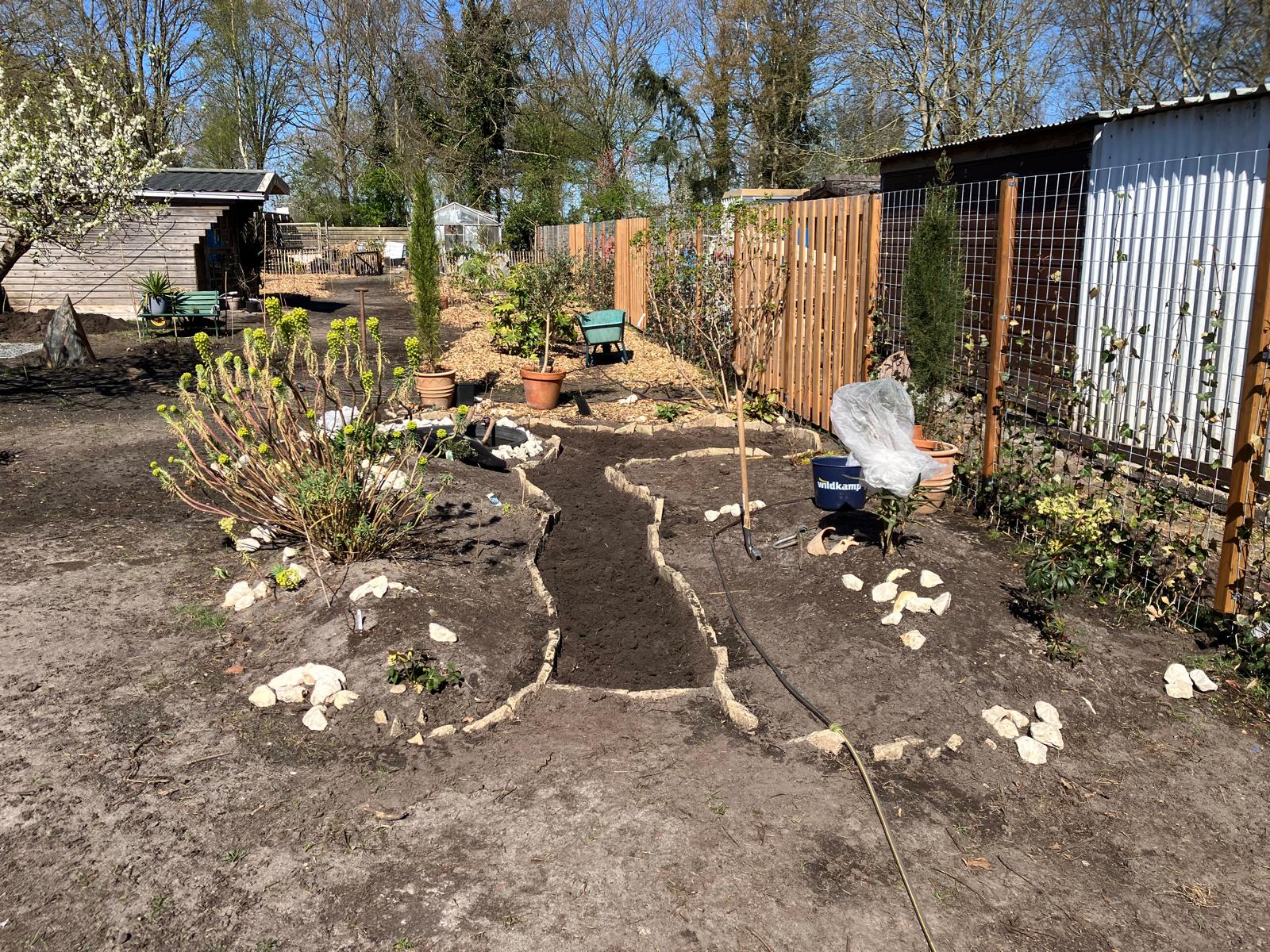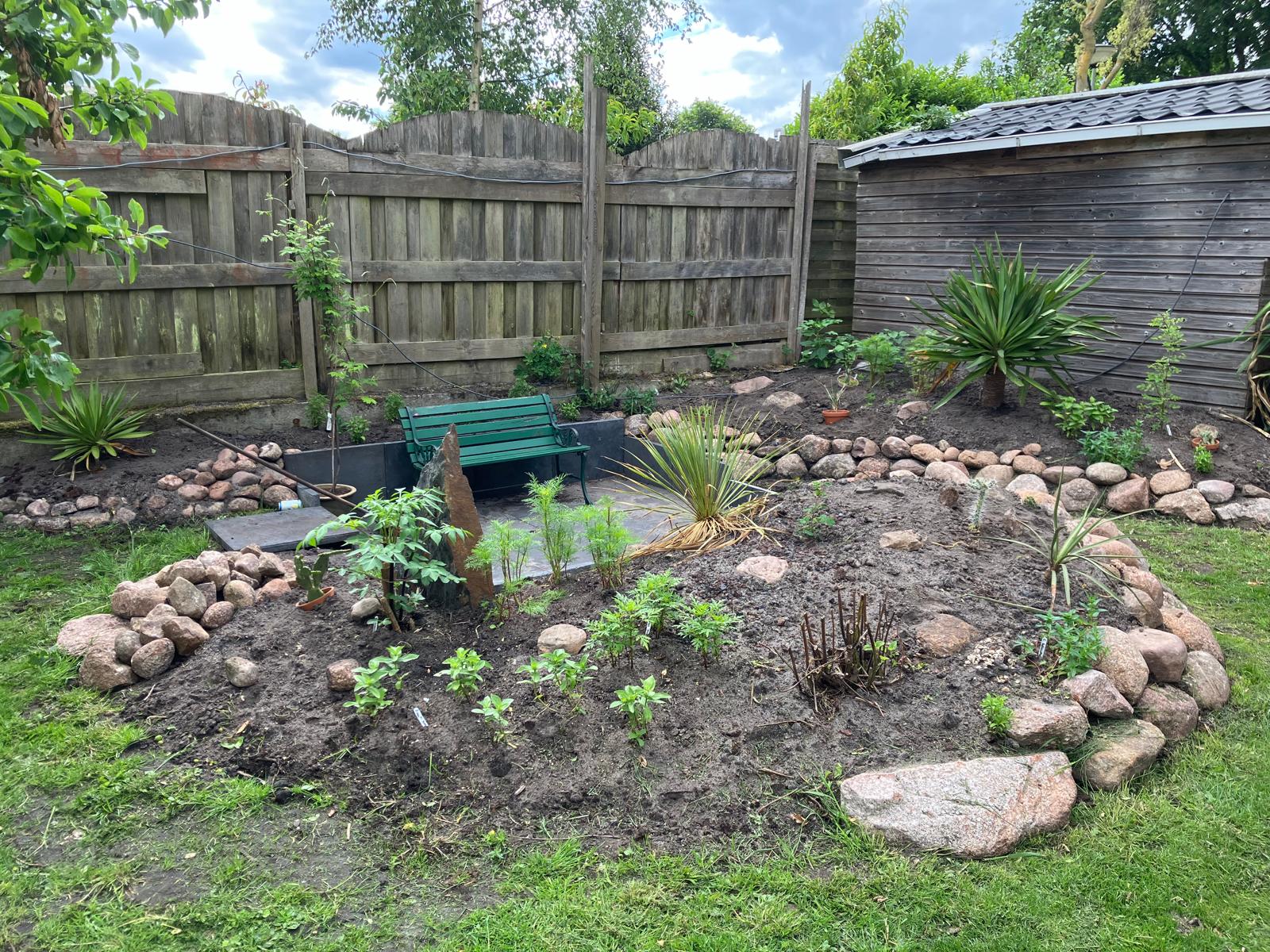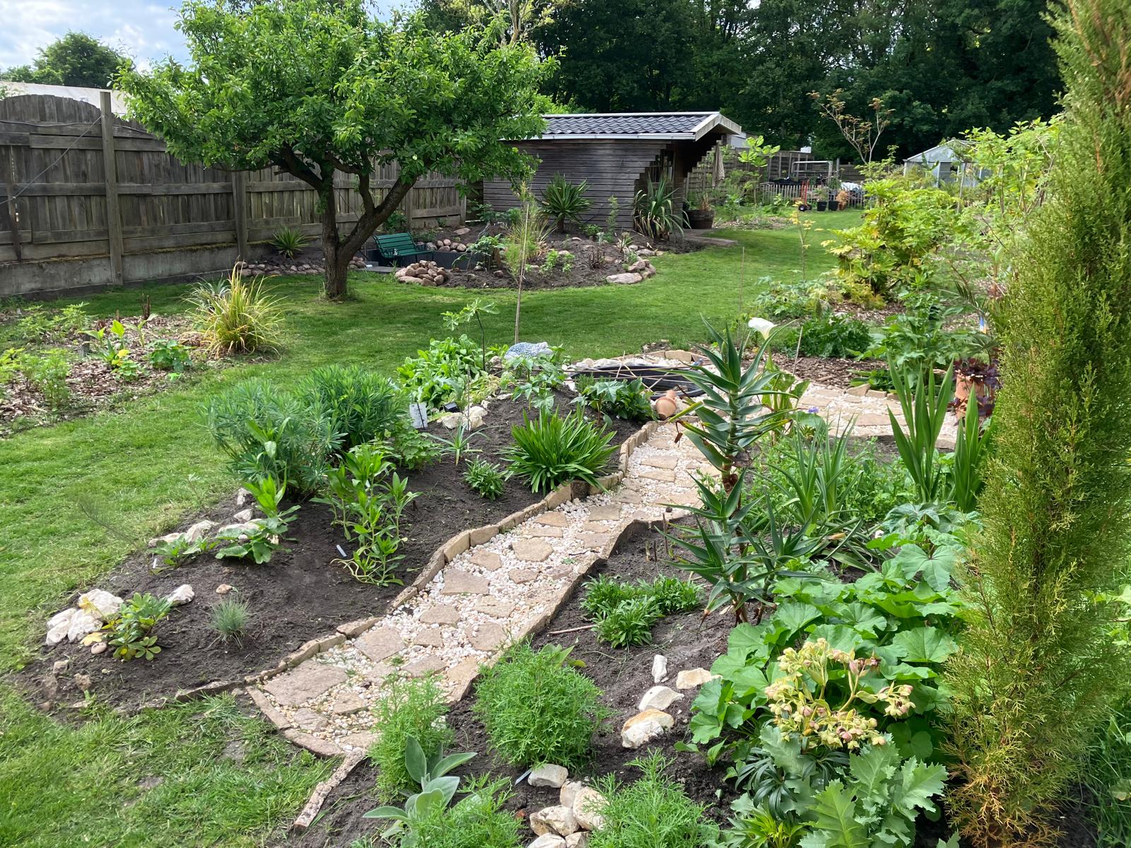 Heel kritisch is de tuin hier net wat te smal voor, een paar meter extra was met het oog op paden en zitplekken iets ruimer.