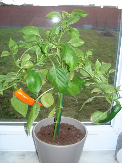 Kiemt héél goed trouwens. Inmiddels is hij bijna 2 keer zo hoog en hangt hij vol paprikaatjes. Vooral omdat ik elke bloem met de vinger bevrucht.
