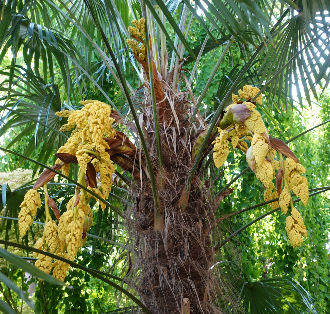 Ik heb hier ook een vrouwelijke Trachy op mijn oprit staan vlak tegen het huis. Geen enkele andere Trachy hier in de straat of buurt binnen 300m zeker. Toch hangen daar ook elk jaar zaden aan. Geen volle trossen zoals achteraan in de tuin, maar toch redelijk wat bevruchte zaden wel. Het lijkt me onwaarschijnlijk dat de wind het stuifmeel helemaal over mijn rijhuis blaast om tot op straat mijn Trachy daar te bestuiven tegen mijn voorgevel. Daarom lijkt het mij toch dat bijtjes en andere insecten meer invloed hebben bij het bestuiven dan we denken.