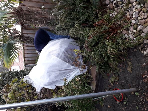 Er wordt vorst voorspeld, een paar planten in de voortuin zijn weer beschermd, de Sabal en Jubuea in de achtertuin worden niet beschermd.