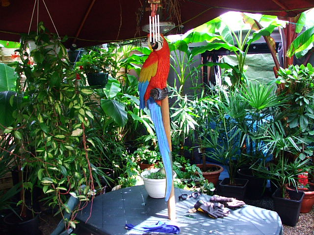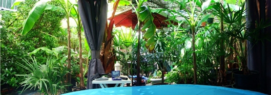 Waar de kas dus stond, staat nu het tentje, en toen het zwembad er stond, stonden de palmen en bananen daar decoratief rond omheen, wat imo wel het mooiste was, maar dit tentje en straks wellicht het gebouwtje, heeft een hoop voordelen, zoals meer warmte, privacy, geen lawaai vd pomp en het gebubbel als je er na een nachtje stappen er nog in wil, en vooral niet elk jaar een kas moeten opbouwen en afbreken.