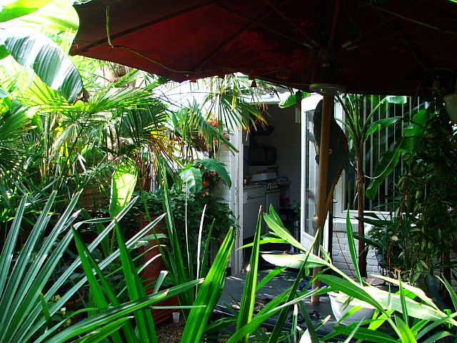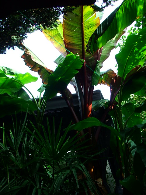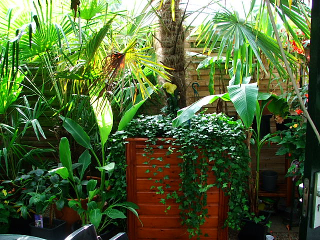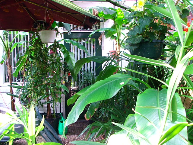 en ik van daaruit zo in de tuin kijk. links zie je nog net een ensete maurelli achter de paal staan wiens hoogste blad op 4 meter hoogte zit.