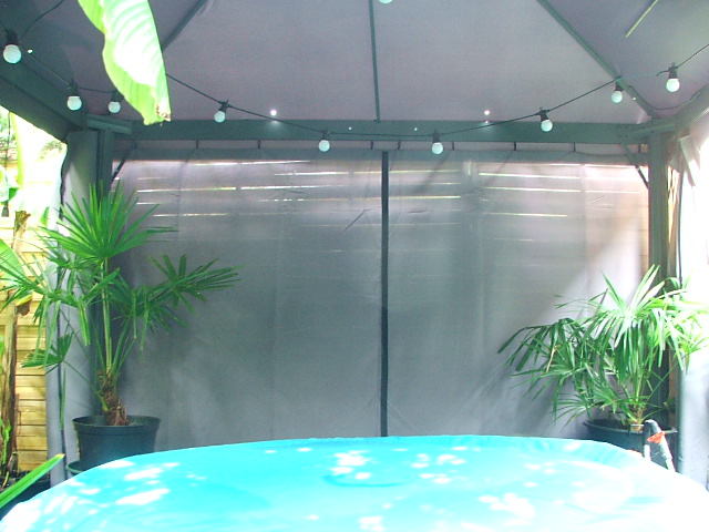 De 2e foto is vanaf de andere kant gemaakt, dus vanuit het tentje waar het bubbelbadje staat