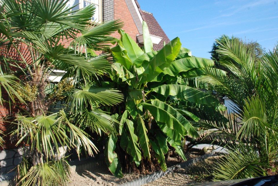 Nee,is een afhangend blad van de basjoo's op de achtergrond,voorlopig geen bloemknoppen te zien bij de Phoenix,zal straks weer inpakken geblazen worden :fluiten: