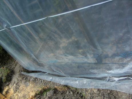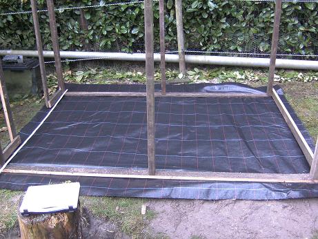 Op de foto kan je zien dat er acht palen staan, dan overlangs een balk, en met plooibare bouwijzers is de ronde vorm gezet. Dan is er overlangs een folie gespannen.
