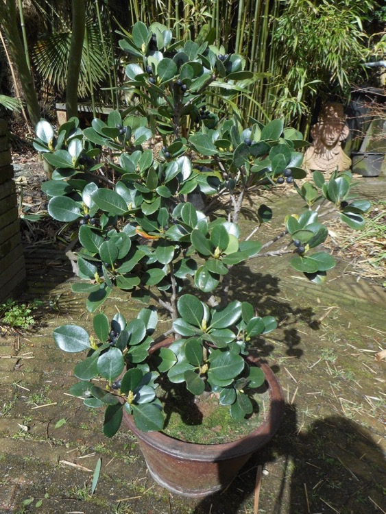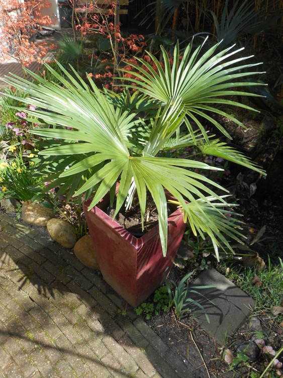 Vandaag beleven we hopelijk de laatste winterstuip, met 6°C en een NNW windkracht 6 is het nog niet bepaald aangenaam. In de zon en beschut voor de wind valt er al genoeg te genieten. Een Acer met oranje blad vormt de jaarlijkse primeur. Rhaphiolepis umbellata mocht voor de foto alvast even uit de kas. Bij de bolletjesvaren verschijnen nieuwe krullen. Onoclea sensibilis dankt zijn Nederlandse benaming aan de sporendragers. Het kangaroepootje is de nieuwste aanwinst. Ik ben benieuwd hoe de hernieuwde kennismaking met deze Anigozanthos 'Beauty Star' zal verlopen. Bij een vorige gelegenheid was het genoegen van te korte duur. Enkele palmen genieten hier een VIP behandeling zoals de Trachycarpus princeps 'New From' en een mini Cerifera in een sierpot die is meegekomen uit Japan.