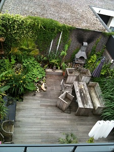 het eerste wat ik gedaan in deze tuin, zijn de zijkanten die ik dicht getimmerd heb.zoals je ziet bestaat deze uit trespa-platen en hardhout. het trespa was al aangebracht. De rest is alles gewijzigd of uit mijn oude tuin meegenomen.