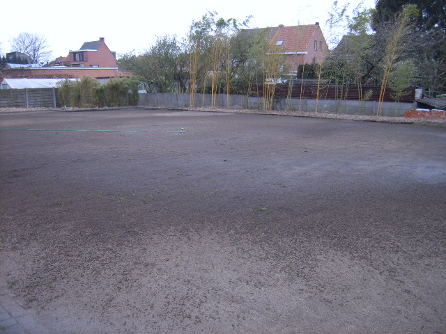 braakliggend?? heb ik juist allemaal met de grondfrees omgedaan en opnieuw ingezaaid zodat ik een mooi groen grastapijt heb dit jaar. Naast het tuinhuis is een heel grote plek voorzien voor al de exoten. Momenteel staan hier enkel een Dicksonia en antractica dewelke ik ooit van Ro gekocht heb. Verder is alles bedekt met een zeer dikke laag boomschors.
