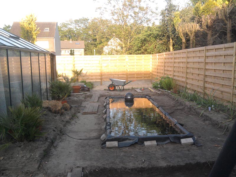 Nu nog het aanbrengen van gestabiliseerd zand rond de vijver om de houten 'vlonder' aan te leggen rondom rond (niet zelf gedaan, geen tijd ervoor). Links komen er Chamaerops humilissen en rechts een combinatie van Phormium tenax en Yucca filifera. Hier is weinig variatie in de beplanting om het strakke en open karakter aan te houden.