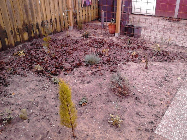 Helemaal achteraan begint de achtertuin waar de meeste verhuisde planten en plantjes staan. Niet op de foto: Naar rechts nog de Albizia coreana.