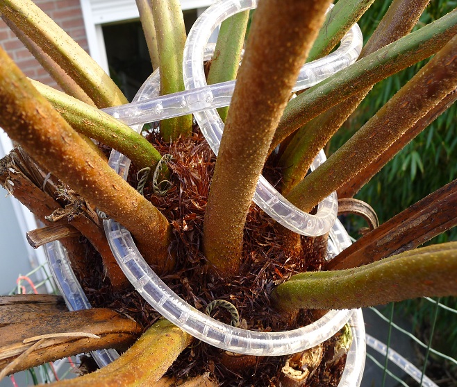 Het grote voordeel van niet alles in potten te hebben, is natuurlijk dat je in de wintertijd ook een groene (of witte) tuin hebt. Met name bamboe zorgt voor de altijd groene tuin.