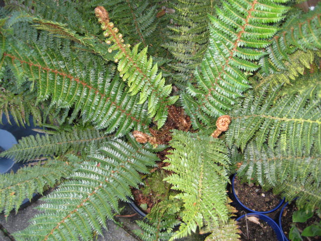Hallo, gisteren was deze aan de beurt, de Polystichum vestitum, hij stond al 5 jaar in de zelfde pot en was al vrij diep weggezakt in die pot, en je geen stamvorming of groeipunten kon zien! De bladeren begonnen ook goed te verkleuren en tot mijn verbazing zag ik een 10 tal veren met sporen zitten die we dan ook maar meteen geoogst hebben, daarna zag hij niet meer uit en heb ik maar besloten hem helemaal kaal te maken en hem tevens een maatje groter te zetten.