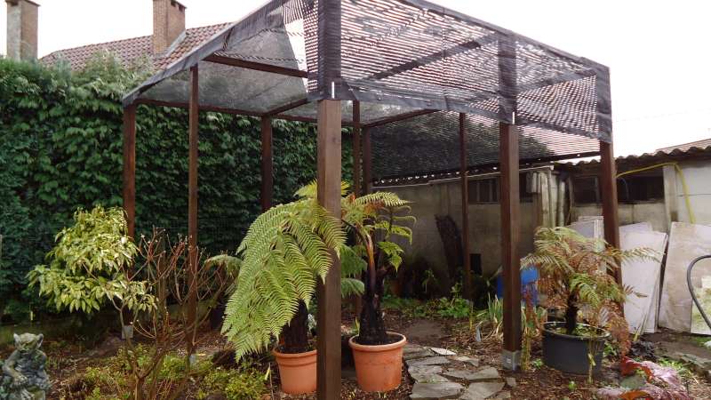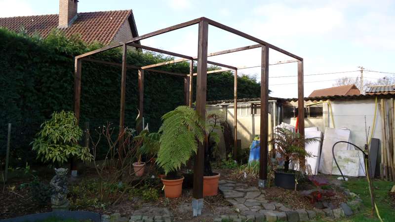 Vandaag eindelijk aan de schaduwhoek begonnen. Palen op gegalvaniseerde steunen in snelcement gezet en geraamte dan afgewerkt. Foto is als alles in elkaar gevezen is. Ondertussen staat het geheel ook al in houtbeschermingsproduct, mooi bruin zodat het geheel beter integreert in de achtergrond. Enkel nog het doek er op en dan ben ik klaar en kan ik de (boom-) en andere varens er een plaatsje onder geven. De afmetingen zijn 4 x 4 m en 3 m hoog. Bedoeling is ook om de eerste 3 steunpalen met draad te bekleden en hiertegen dan bloeiende klimplanten te planten.