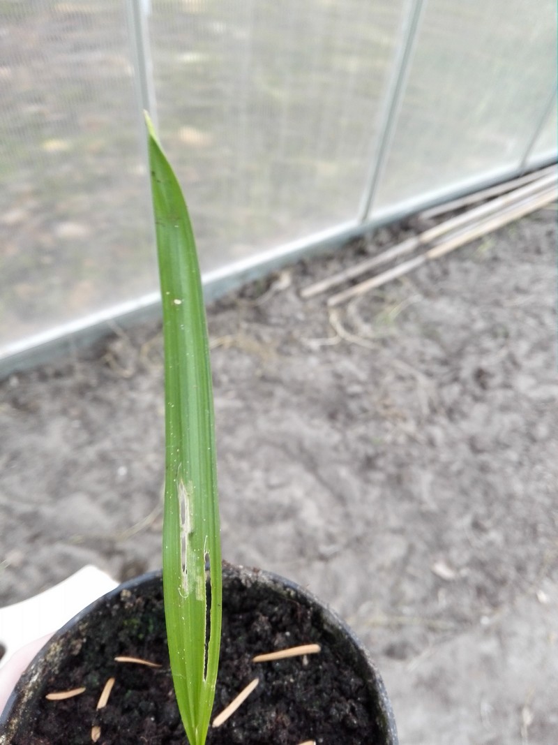 Mijn palmpjes staan buiten in een kas. Ze zijn net een jaar oud, maar ik merk nu t soms wat afkoelt s'nachts dat de bladeren beginnen in te scheuren. In t begin was het bij de jongste palmpjes maar nu ook bij de gene die ik iets langer heb.