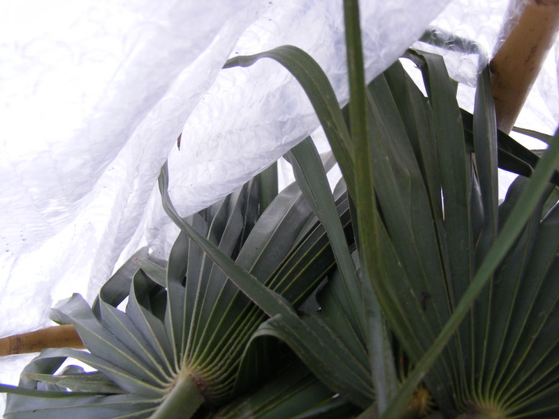 Vandaag ook even foto's gemaakt van mijn winterbescherming. Tot nu toe valt het mij heel erg mee hoe de palmen er buiten in de volle grond uit zien. Bij vorige sneeuw wat ook rond het 0 graden was zagen de palmen er slechter uit en dat was nog met minder vorst. Toen heb ik ook geen bescherming geplaatst.
